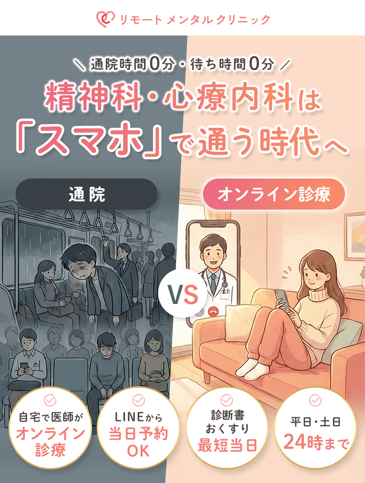 RMC オンライン診療 2026.03.06 心療内科に行こうとしているのに、行くこと自体がストレスになっていませんか? はい いいえ (Q1ではいと答えた方)これまで受診をためらっていた理由はありますか? 忙しくて通院する時間がない 精神科に行くのが怖い抵抗がある 待合室で誰かに会うのが嫌だ 初診予約がなかなか取れない 戻る 今回の診療で「最も重視したい」ポイントはございますか? 通院・待ち時間ゼロ 保険適用で安く済ませたい 誰にも会わずに受診 すぐに診断書やお薬が欲しい 戻る ご希望の診察タイミングはありますか? 今日すぐに相談したい! 2〜3日以内には欲しい 土日・夜間の枠を探したい まずは空き状況を見てみたい 戻る